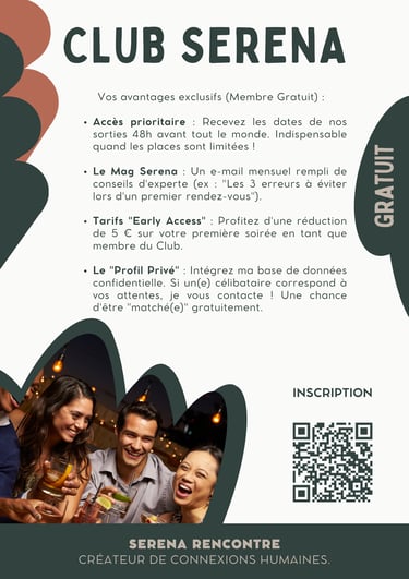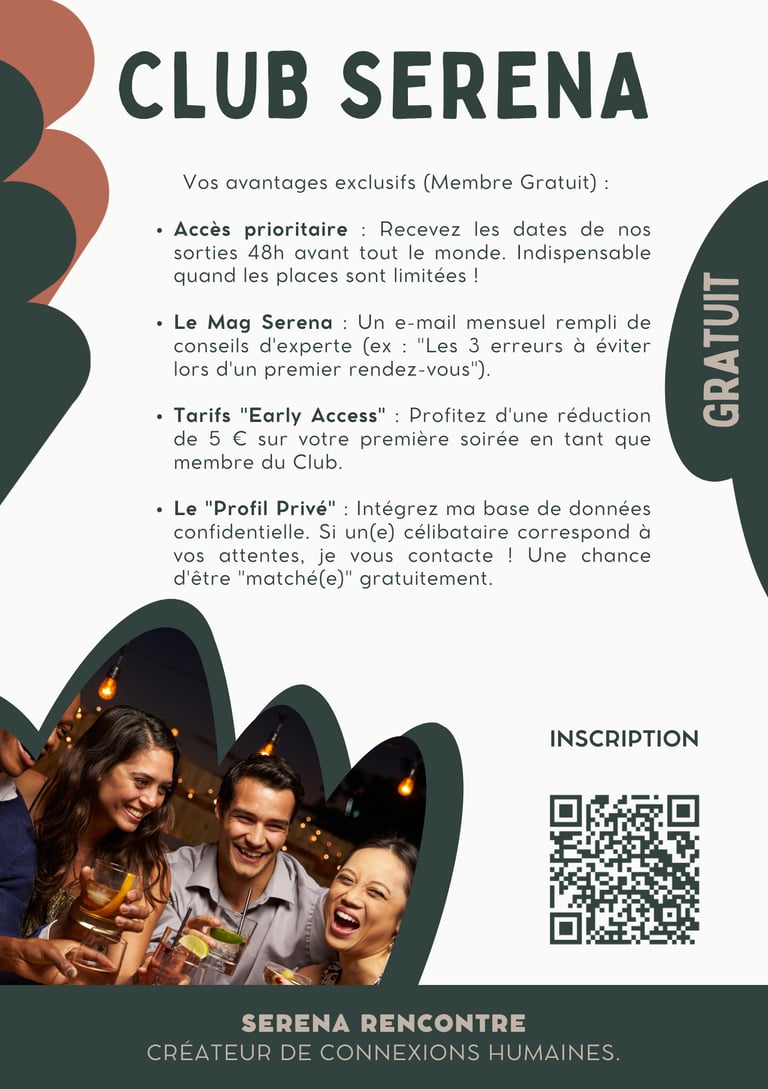 "Parce que la rencontre amoureuse mérite mieux qu'un simple swipe, nous avons créé le Club Esprit Serena. Une communauté bienveillante pour les célibataires qui souhaitent reprendre le contrôle de leur destin amoureux.